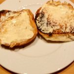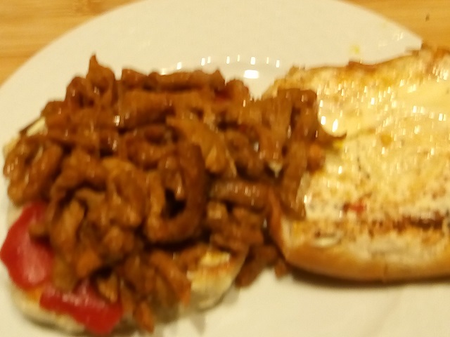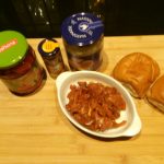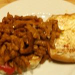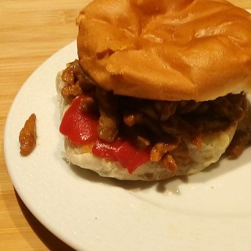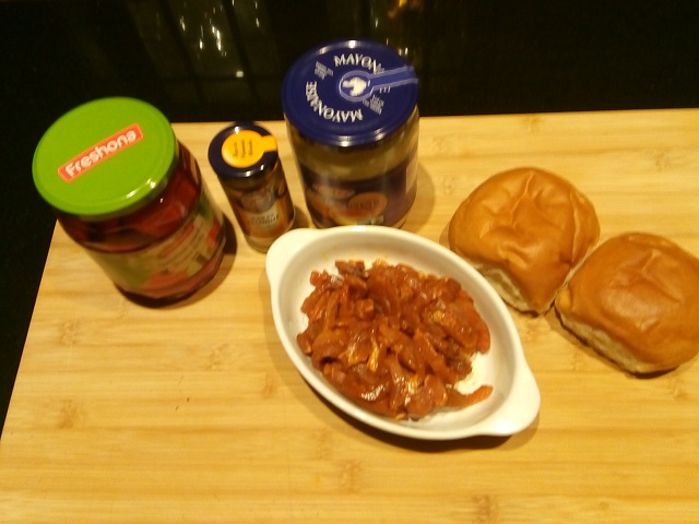 Leg op elk bolletje een gegrilde paprika. Verdeel hier het shoarmavlees op. Leg hier de bovenhelft van het bolletje op.