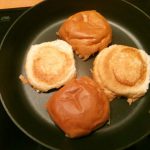 Snijd de bolletjes doormidden en laat ze in een droge koekenpan warm worden.