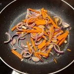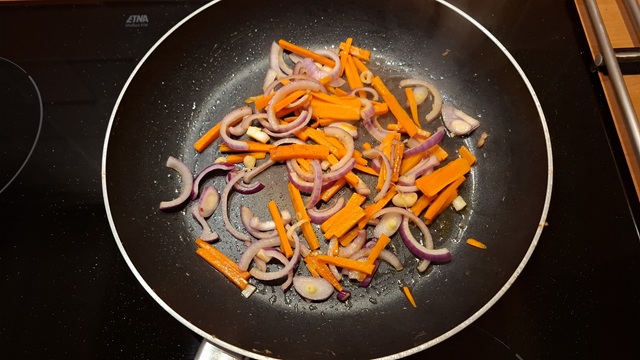 Voeg de rest van de olie toe. Zodra deze heet is voeg dan de ui en de wortel toe en bak deze tot de wortel wat zachter is geworden.