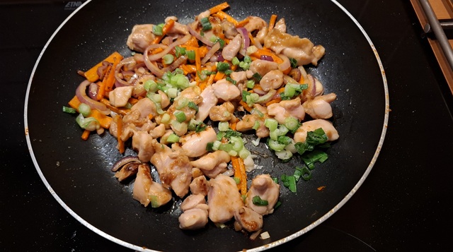Voeg de kip en de lente-ui en bak deze nog even op hoog vuur. Besprenkel deze met de rest van de rijstwijn. Zet de warmtebron uit en verdeel het gerecht over de borden.