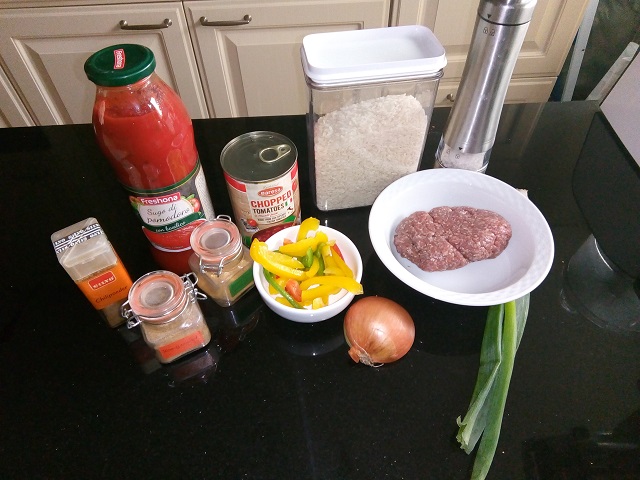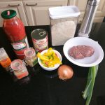Zet alle ingrediënten klaar. Pel en snipper de ui. Snijd de paprika in blokjes. Snijd de lente ui in ringetjes.
