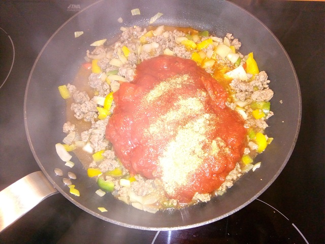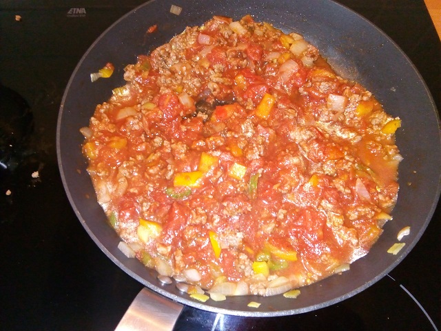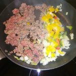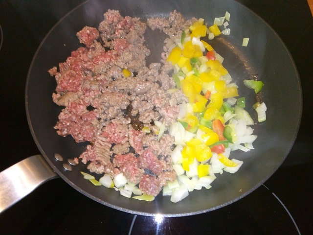 Verhit de olie in een koekenpan op middelhoog vuur. Voeg de ui, paprika en het gehakt toe. Bak het gehakt rul.