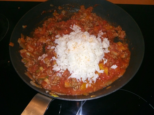 Voeg de gekookte rijst toe en meng het geheel door elkaar.
