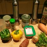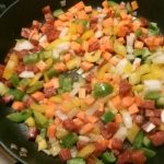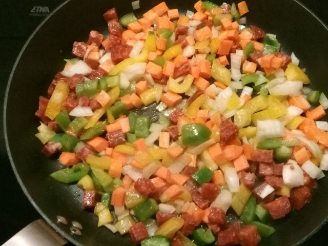 3. Verhit de olijfolie in een koekenpan op middel hoog vuur. Bak hierin de groenten met de chorizo gedurende 10 tot 15 minuten.
