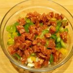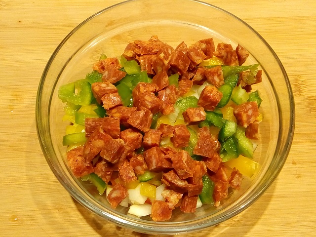 2. Maak de paprika's schoon. Verwijder het vel van de chorizo. Snijd de paprika's, wortel en chorizo in blokjes. Snipper de ui.