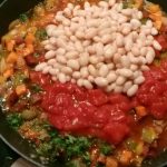 4. Voeg dan de paprikapoeder, tijm, peterselie, tomatenblokjes, kippenbouillon, witte bonen en wat zout en peper.