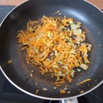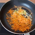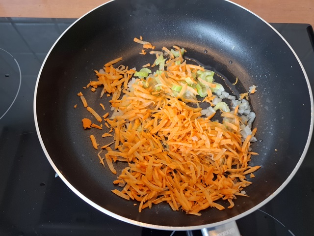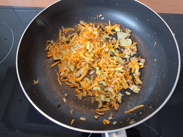 Verhit in een hapjespan de olie en fruit de ui tot deze glazig is. Voeg dan de knoflook toe en fruit deze een halve minuut mee. Voeg dan de wortel en de bleekselderij toe.