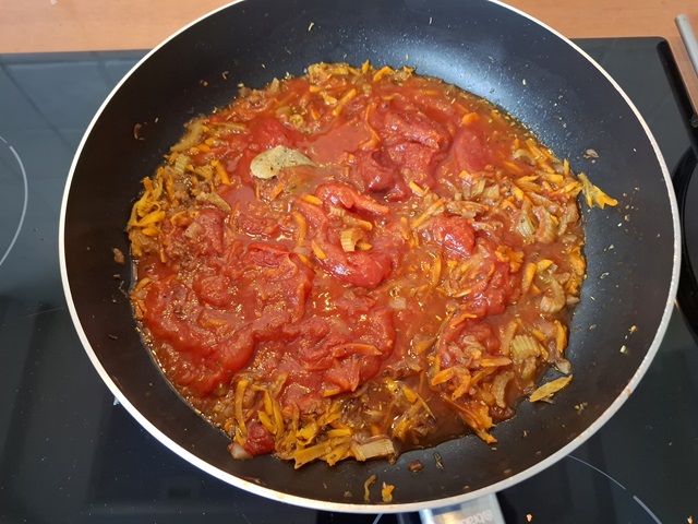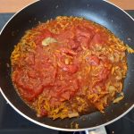 Blus af met de wijn en voeg de inhoud van de blik tomaten toe samen met de tomatenpuree. Voeg wat zout en chilipoeder toe. Laat een minuut of 5 zachtjes doorkoken.