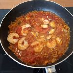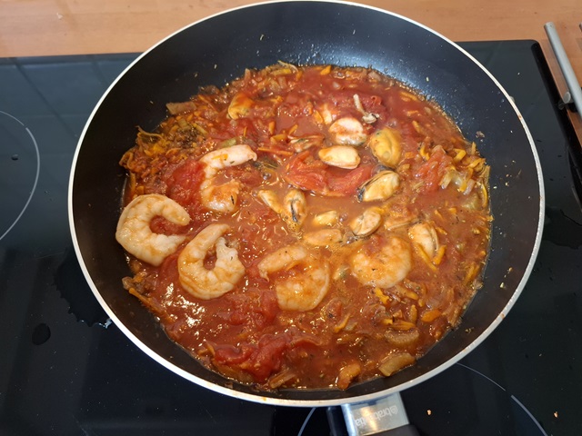 Voeg de garnalen en de mosselen toe. Doe het deksel weer op de pan en laat zachtjes pruttelen.