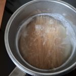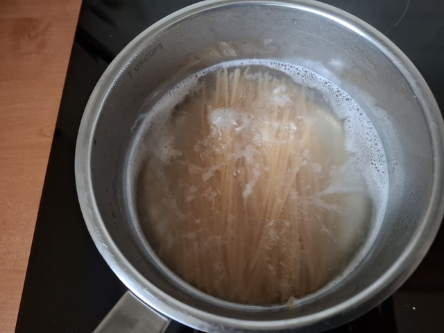Kook intussen de spaghetti in gezouten water volgend aanwijzingen op de verpakking. Giet de pasta af en meng deze door de saus. Proef en breng verder op smaak met wat zout en chilipeper. Mocht de saus wat de dik zijn voeg dan een beetje water toe.