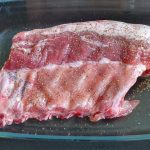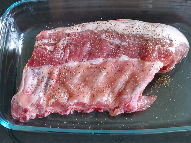 Strooi zout en peper over de onder en bovenzijde van de ribs. Dek de schaal af met aluminiumfolie. Zet de schaal in de oven en bak de ribs gedurende 2 uur.