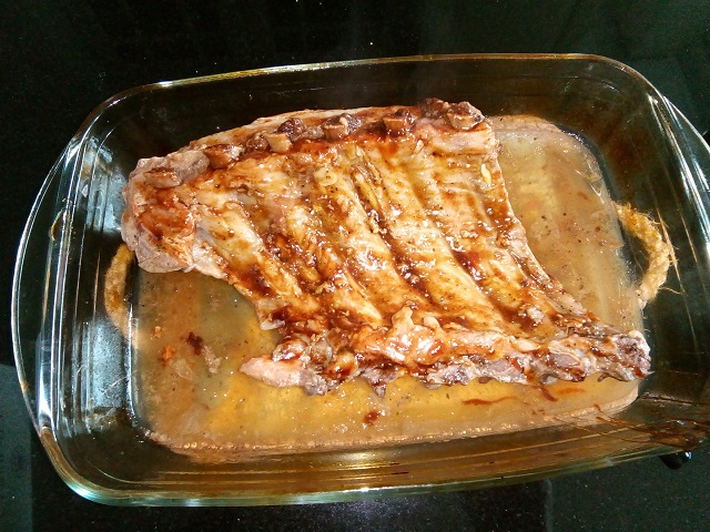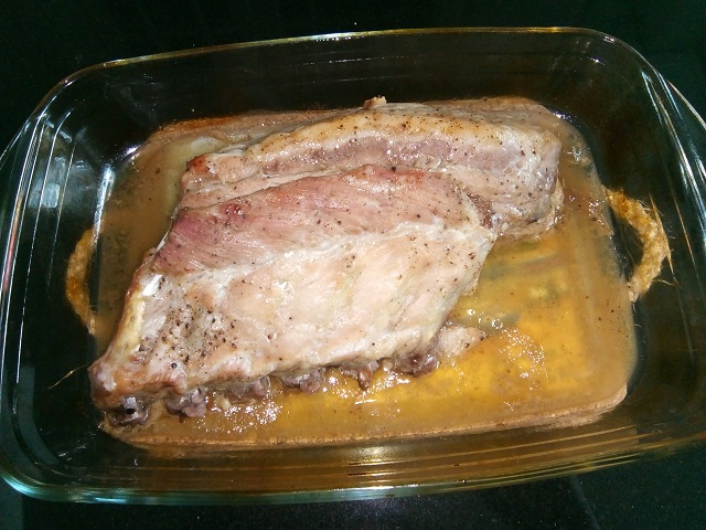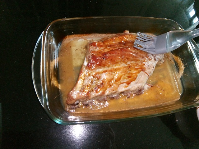 Leg de ribs in een passende ovenschaal. Giet de appelsap over de ribs.