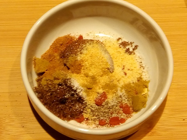 Meng alle ingrediënten voor de rub in een bakje.