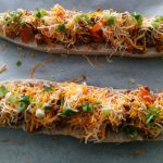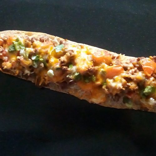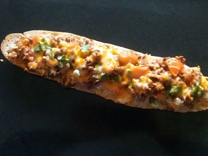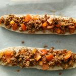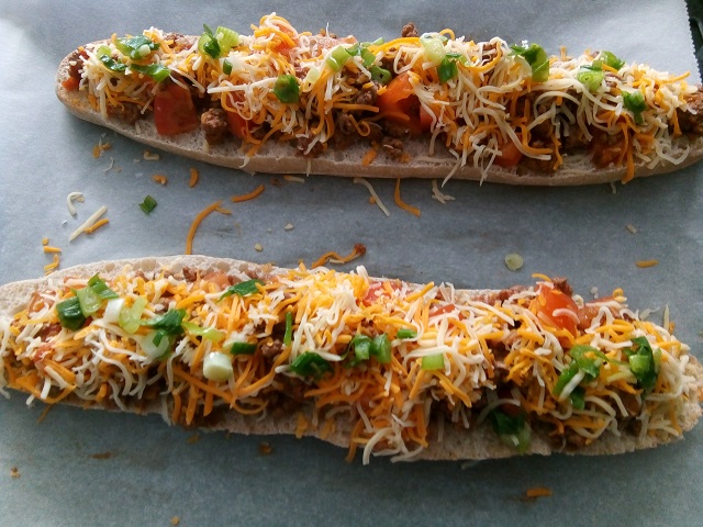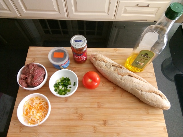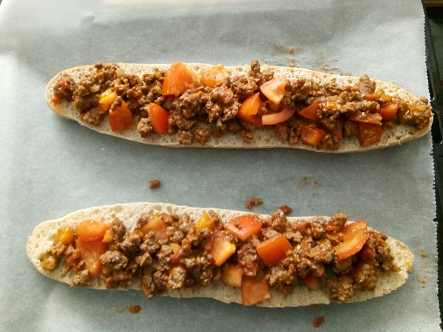 4. Snijd het stokbrood overdwars door midden. Verdeel het gehaktmengsel over de broodhelften.