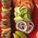Verwarm de olie in een koekenpan en bak het vlees aan alle kanten aan. Haal het vlees uit de pan en bewaar. Pel en maak de gamba’s schoon. Bak de gamba’s. Haal de gamba’s uit de pan.