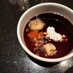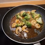 Voeg dan de saus toe en kook deze nog eens 2 – 3 minuten tot de saus begint te bubbelen en indikt. Top af met de lente ui en sesamzaad.