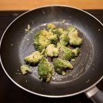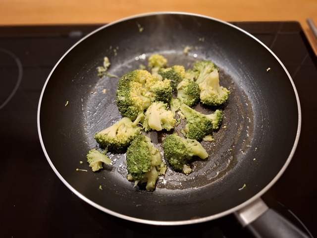 Verhit in een ruime koekenpan de sesamolie op middelhoog vuur en voeg de broccoli toe. Roer deze een paar minuten zodat deze wat zachter wordt.