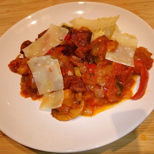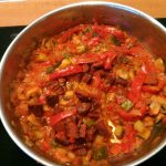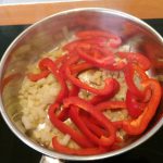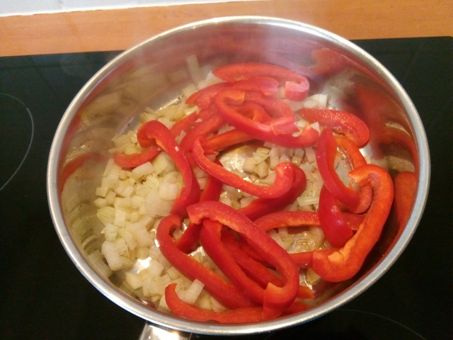 Doe 1 el. olie bij de chorizo-olie en fruit hierin de ui. Doe daar dan de reepjes paprika bij en laat een paar minuten mee fruiten.