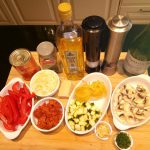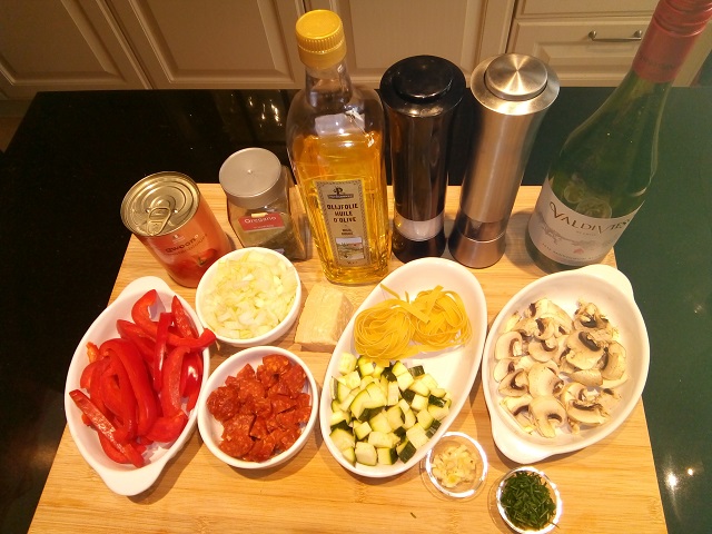 Zet alle ingrediënten klaar. Pel en snipper de ui en de knoflook. Maak de paprika schoon en snijd deze in reepjes. Veeg de champignons schoon met een stukje keukenpapier en snijd deze in plakjes. Snijd de bieslook fijn. Haal het vel van de chorizo en snijd deze in blokjes.
