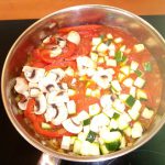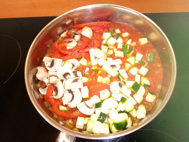 Voeg de courgette, de champignons, de knoflook, de bieslook en de oregano toe en bak deze mee. Breng op smaak met wat zout en peper.