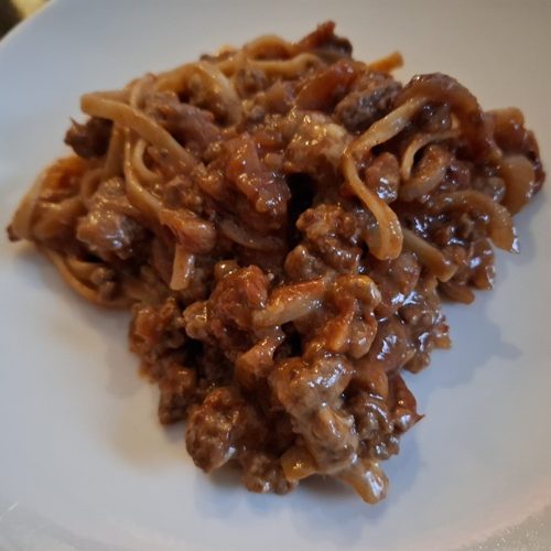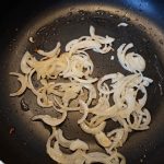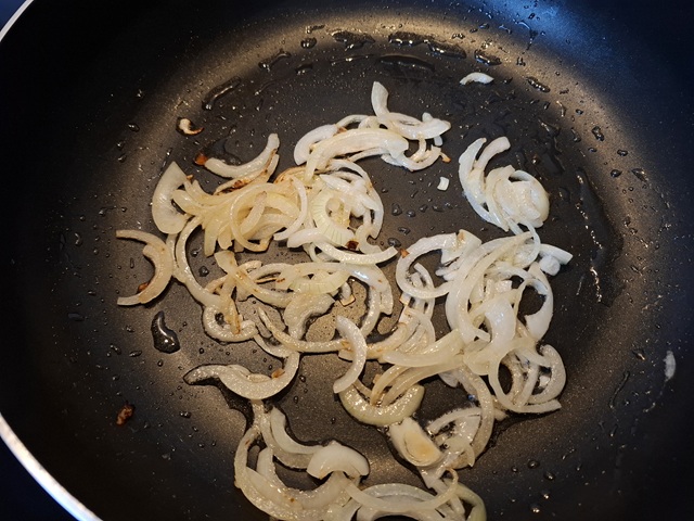 Verhit de olie in koekenpan en fruit de uienringen tot ze glazig zijn.
