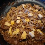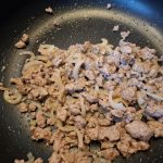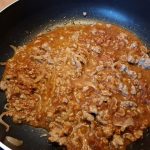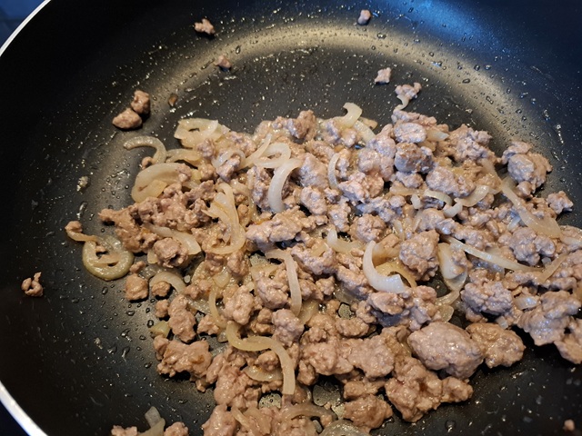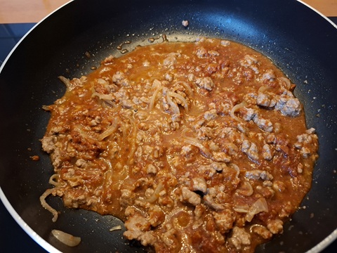 Voeg het gehakt toe en rul dit. Laat zachtjes bakken tot deze gaar is. Voeg op het laatst de knoflook toe.