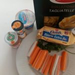 Snijd de surimisticks in drieën. Kook de tagliatelle in water met wat zout volgens aanwijzing op de verpakking. Giet af, maar bewaar wat van het kookvocht, voor het geval de saus te dik is.
