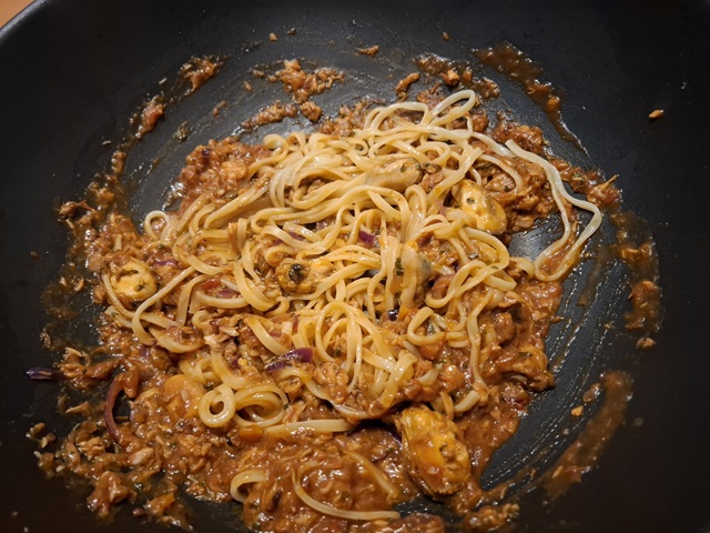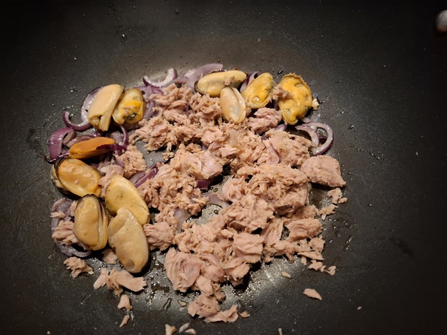 Voeg de tonijn, mosselen en eventueel de olijven toe en bak ze 1 minuut mee.