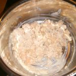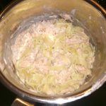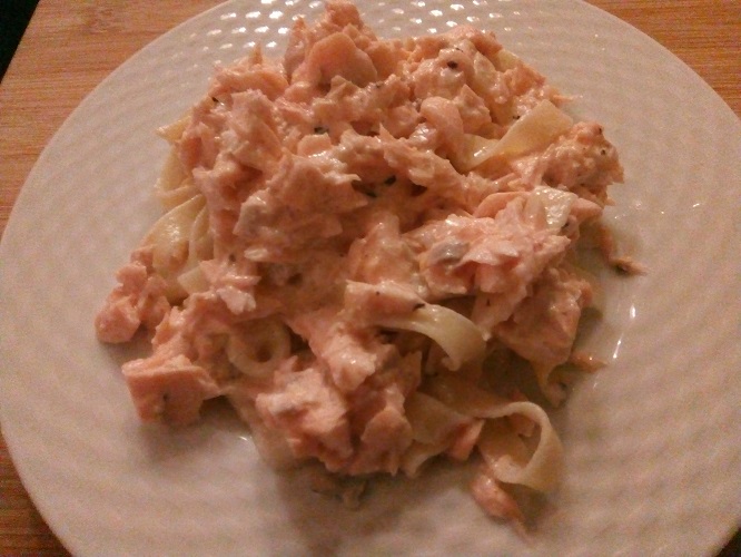 Haal de zalm uit de pan, verwijder het vel en maak klein door met 2 vorken uit elkaar te trekken. Doe de moten zalm in een pan en roer er de crème fraîche door. Doe dit op laag vuur zodat de crème fraîche zacht en vloeibaar wordt.