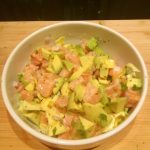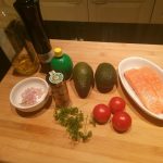 Zet alle ingredienten klaar. Pel en snipper de sjalot. Hak de peterselie fijn. Ontvel, indien nodig, de zalm en snijd in blokjes. Snijd de avocado over de lengte in tot op de pit. Draai de bijde helften tegen elkaar in. Haal de pit eruit. Ontvel de avocado en snijd in blokjes,