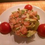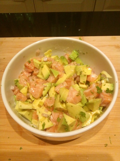 Doe de sjalot, zalm en avocade in een schaal en besprenkel met linmoensap. Het sap voorkomt verkleuring van de avocado wn geeft een lichte garing aan de zalm (ceviche garen). Breng op smaak met wat zout en piment despelete en de olijfolie. Voeg de peterselie toe en meng het geheel goed door elkaar. Zet tot gebruik weg in de koelkast.