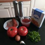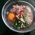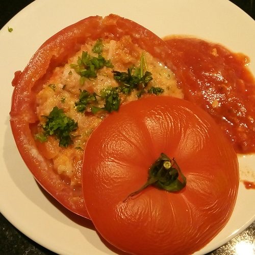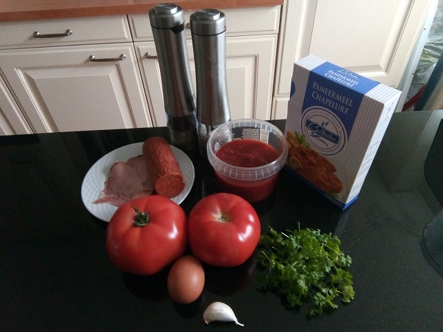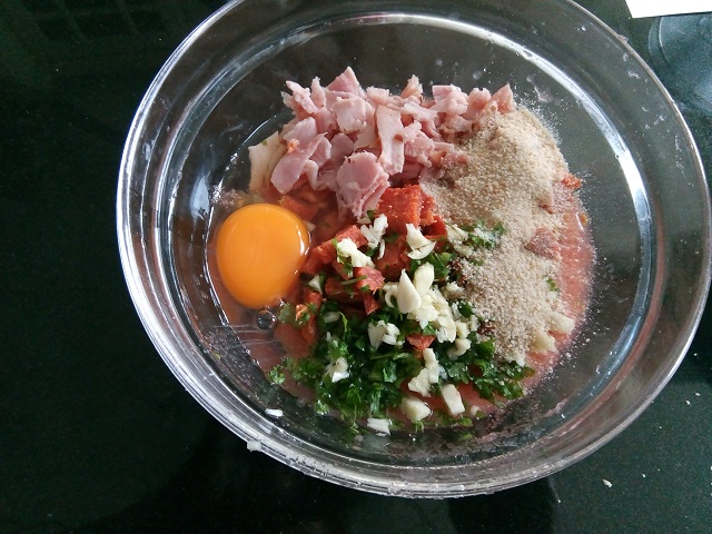 Men in een kom de inhoud van de tomaten, ham, chorizo, knoflook, ei, zout en peper. Meng door elkaar. Voeg wat paneermeel toe zodat het geheel minder vochtig wordt. Meng de helft van de peterselie door het mengsel.