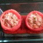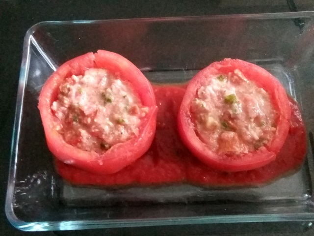 Vul de tomaten met het mengsel. Schep de tomatensaus in een ovenschaal. Zet hier de tomaten in.