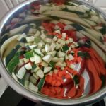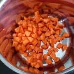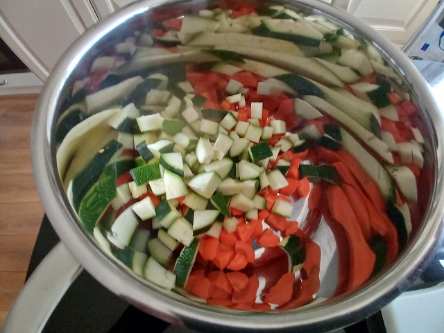 Was de courgette, snijd de uiteinden eraf en snij in blokjes. Doe bij de wortel in de pan.