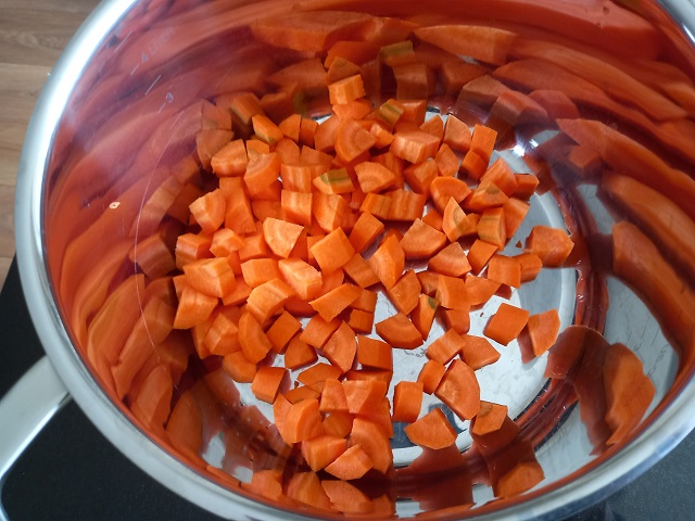 Schil de wortelen en snijd deze in stukjes. Doe in een ruime pan