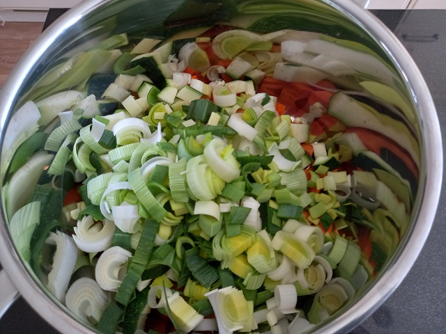 Snij de prei in de lengte doormidden en was goed onder koud stromend water. Snijd het kontje ervan af. Snij de prei in halve ringetjes. Doe in de pan.