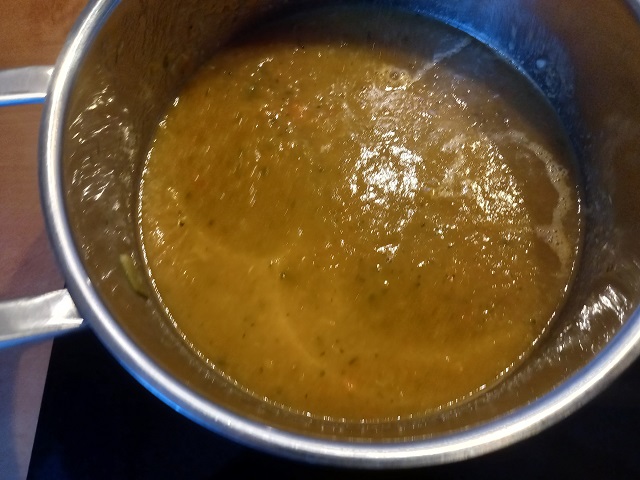 Voeg 1½ liter water en de bouillonblokjes toe met wat zout en 4 seizoenen peper. Breng aan de kook en laat dan 30 minuten zachtjes koken. Pureer met de staafmixer. Proef en breng verder op smaak net zout en/of peper.