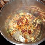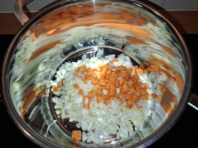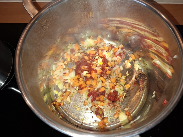 Verhit 2 el olijfolie in een ruime soeppan. Fruit de ui en de wortel. Zodra de ui glazig begint te worden voeg dan de knoflook toe. Laat nog een half minuutje fruiten.