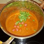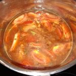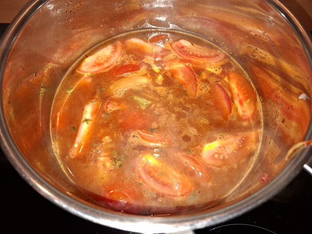 Voeg de tomaten, water en de bouillonblokjes toe. Breng aan de kook en laat een kwartiertje koken op niet te hoge temperatuur. Het moet net aan pruttelen. Met deksel op de pan.