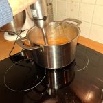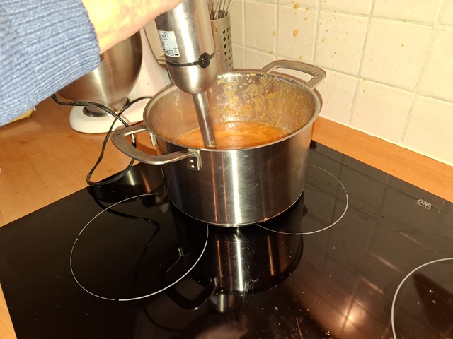 Pureer de inhoud van de pan met een staafmixer. Proef en breng eventueel op smaak met wat peper.