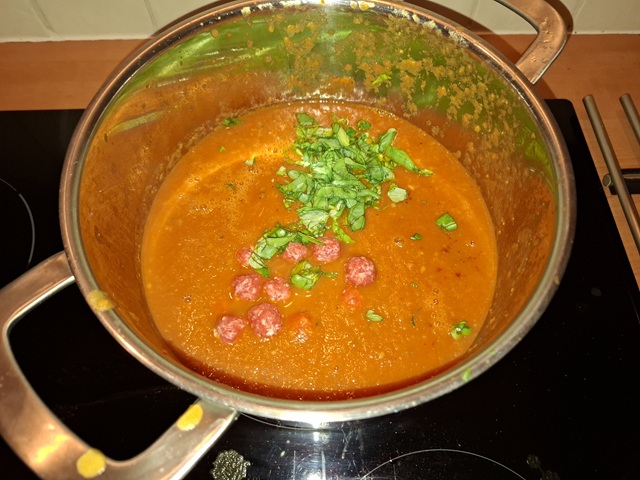 Voeg de pesto toe en de gesneden basilicum toe. Voeg de gehaktballetjes toe en laat nog 10 minuten zachtjes prutellen.