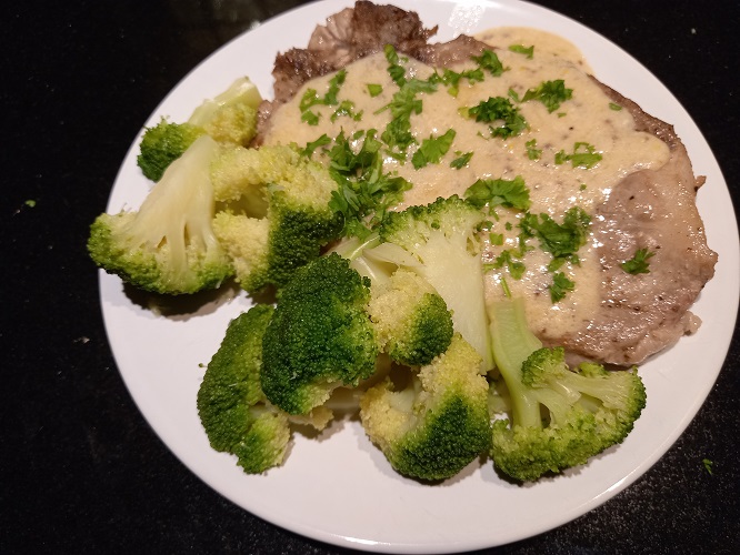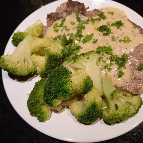 Voeg de Worcestershire saus toe en roer goed door elkaar. Haal de karbonades uit de oven en verdeel over de borden. Giet er de saus over. Serveer met bijvoorbeeld broccoli. Garneer met de peterselie.