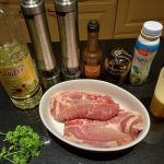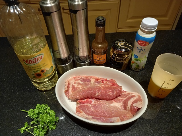 Verwarm de oven voor op 175° boven en onder warmte. Zet alle ingrediënten klaar. Snijd de peterselie fijn. Bestrooi de karbonades aan beide kanten met peper en zout.