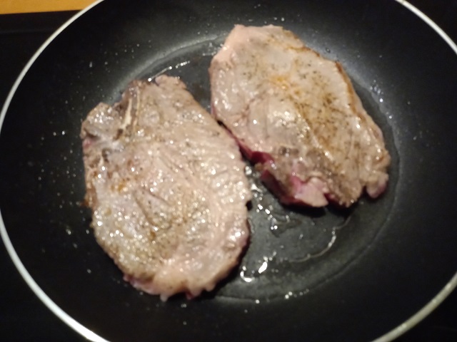 Verhit de olie in een koekenpan en bak de karbonades 3 minuten per kant. Doe de karbonades in een ovenschaal en zit gedurende 6 minuten in de oven.
