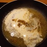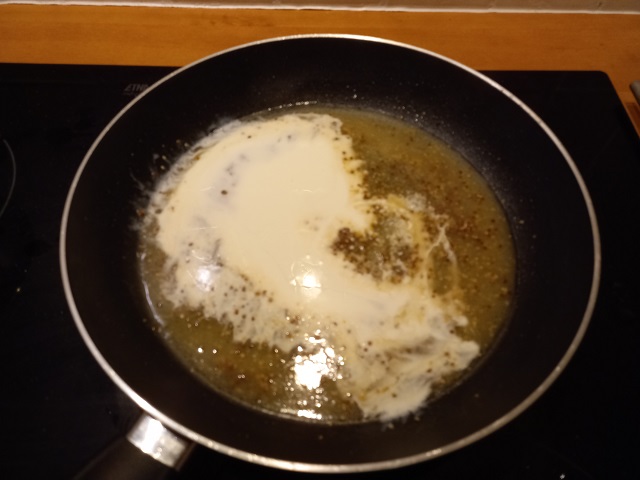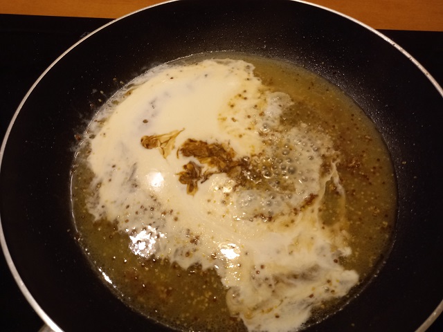 Blus de koekenpan af met de bouillon. Breng de bouillon aan de kook. Voeg de mosterd toe. en roer goed door elkaar.