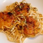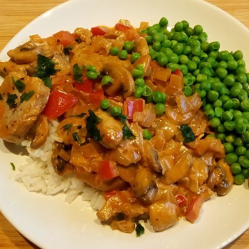 Verdeel de rijst, doperwtjes en varkenshaas met de saus over de borden. Garneer met de peterselie.
