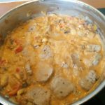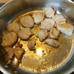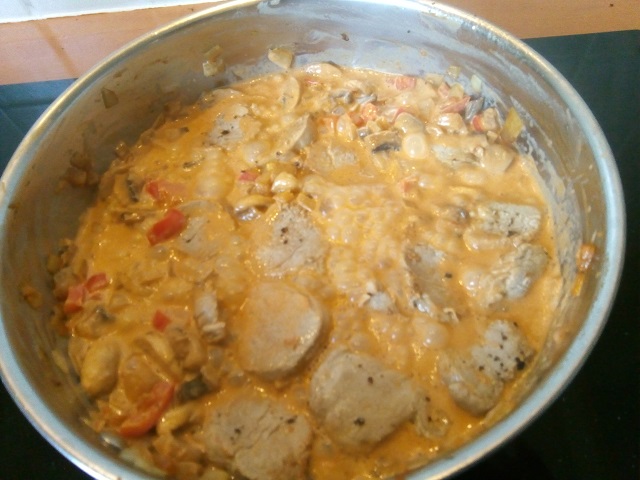 Voeg nu de plakjes varkenshaas toe en laat deze nog verder garen en door verwarmen.