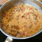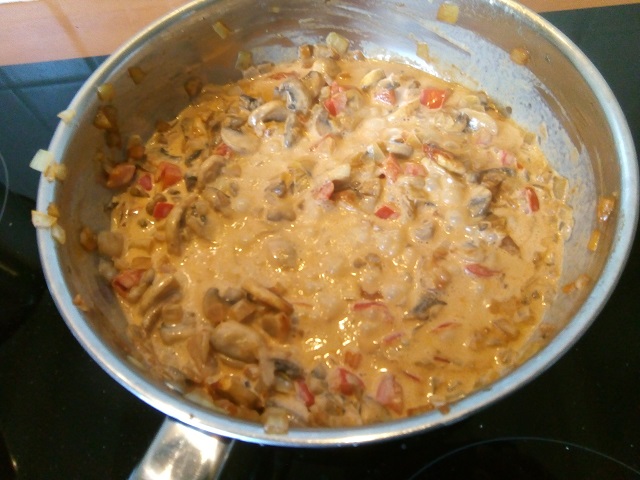 Voeg de slagroom toe aan het paprika champignons, ui mengsel. Meng goed door elkaar.
