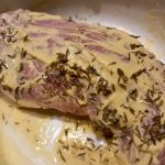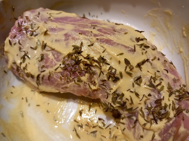 Smeer de varkenshaas in met 2 el. mosterd, tijm en witte wijn. Leg deze in een schaal en dek af met huishoudfolie en zet dez een uur in de koelkast om te marineren. Haal hem er daarna uit en laat op kamerthemperatuur komen.