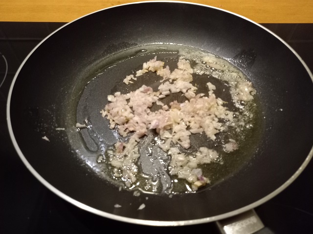 Verhit op middenhoog vuur een koekenpan met de boter en een el. olie. Fruit de sjalot tot deze wat zachter zijn.